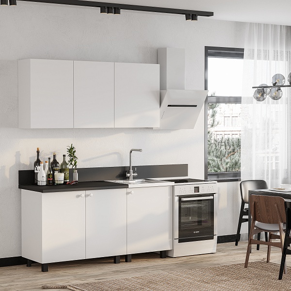 «Куба» - это компактная современная кухня с лаконичным дизайном. Контрастное сочетание белых фасадов и столешницы, декорированной под черный мрамор, сделает вашу кухню яркой и стильной. Прямые строгие линии данной модели, а также отсутствие лишних деталей позволят создать гармоничное и уютное пространство.